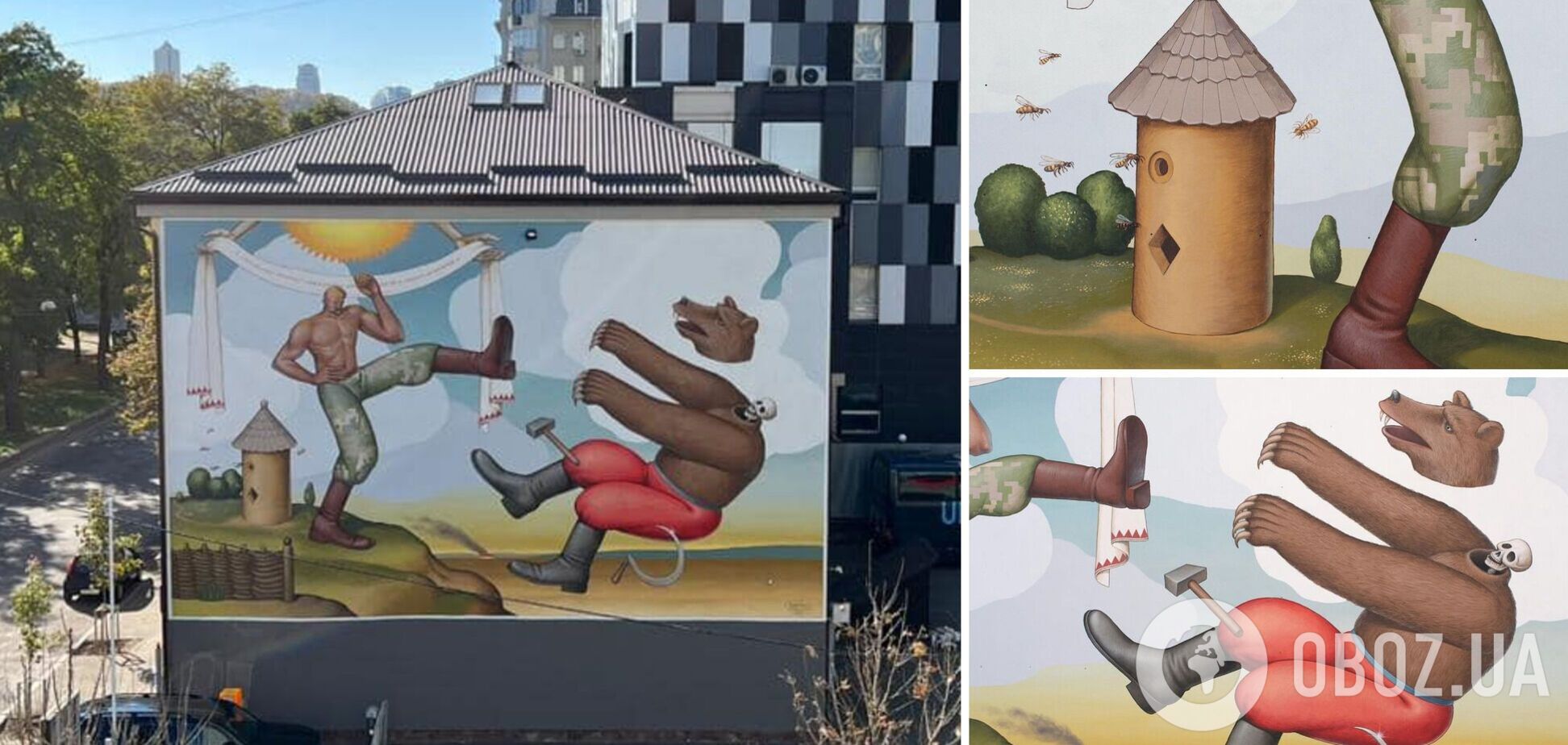 A new mural appeared in Kyiv: a Ukrainian Cossack defeats the bear invader.